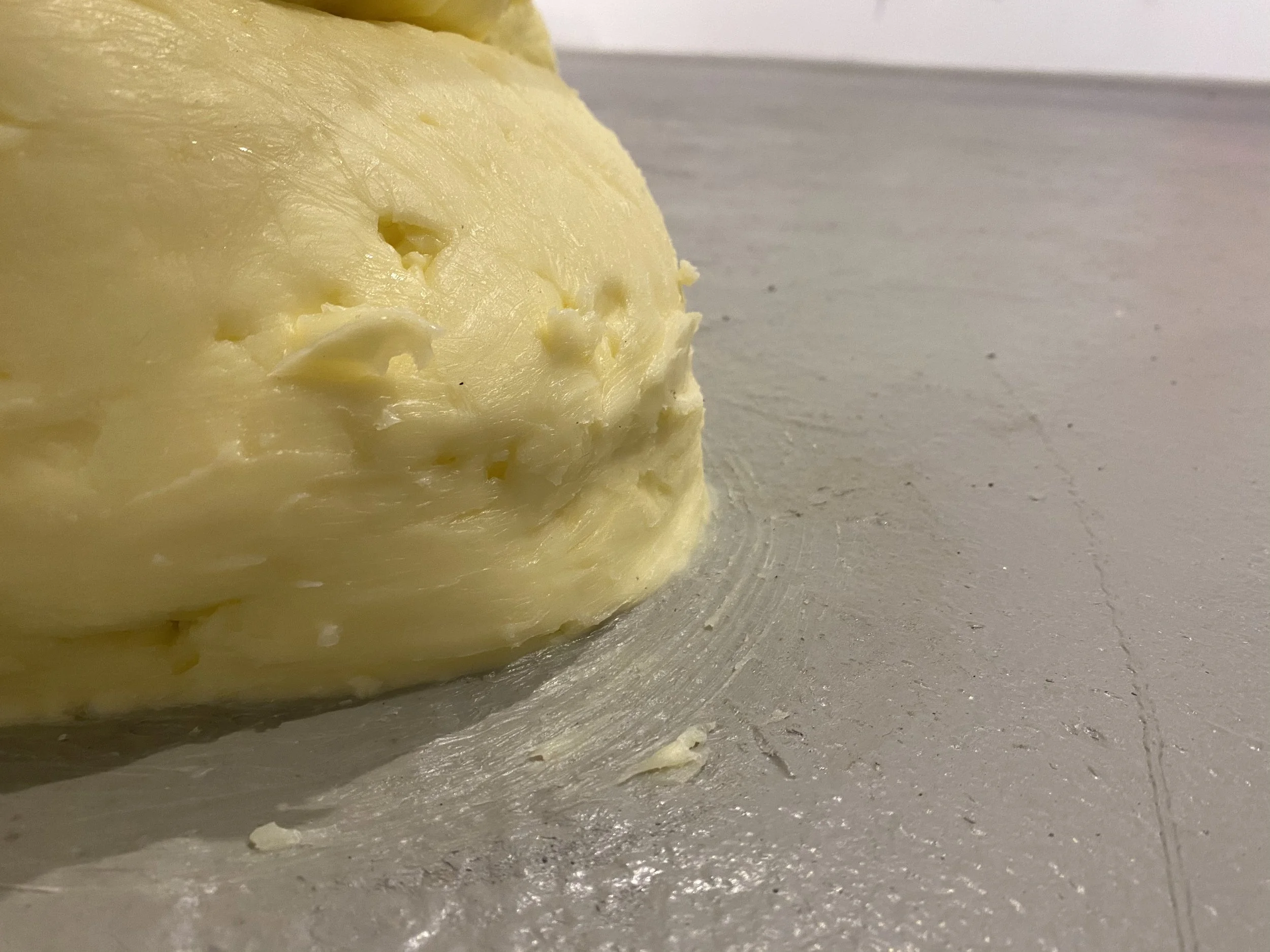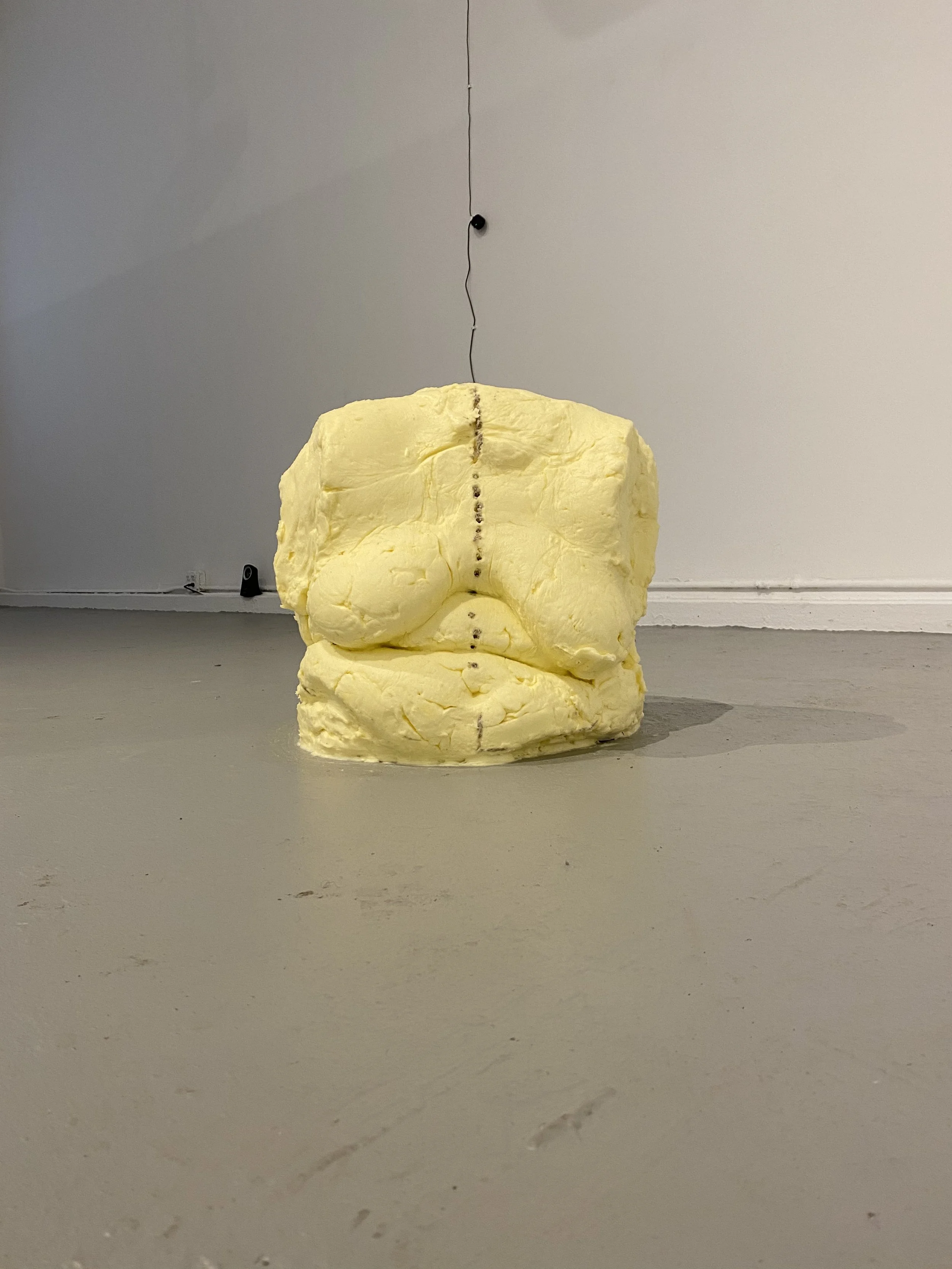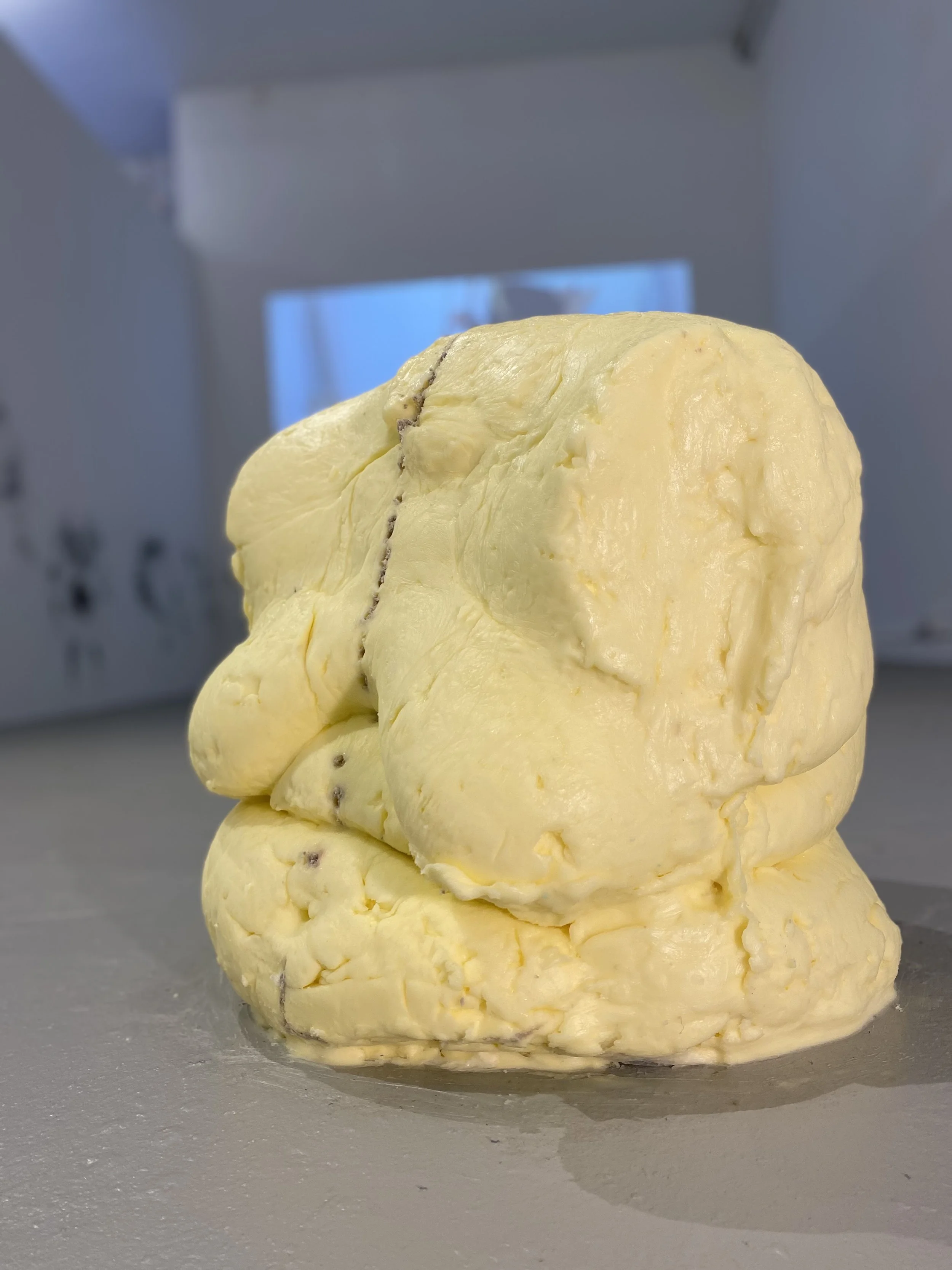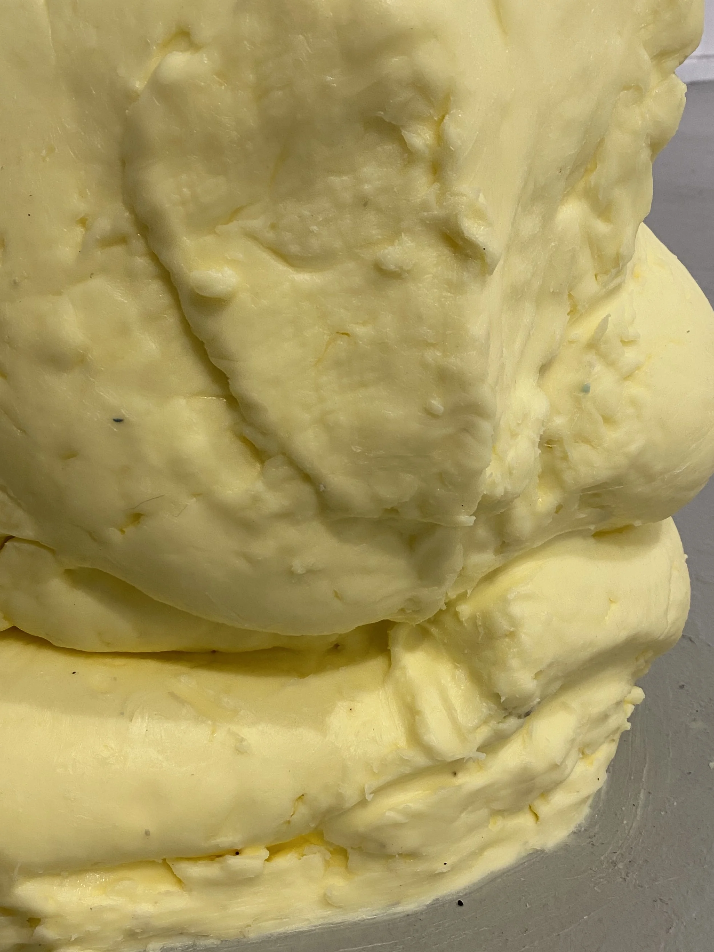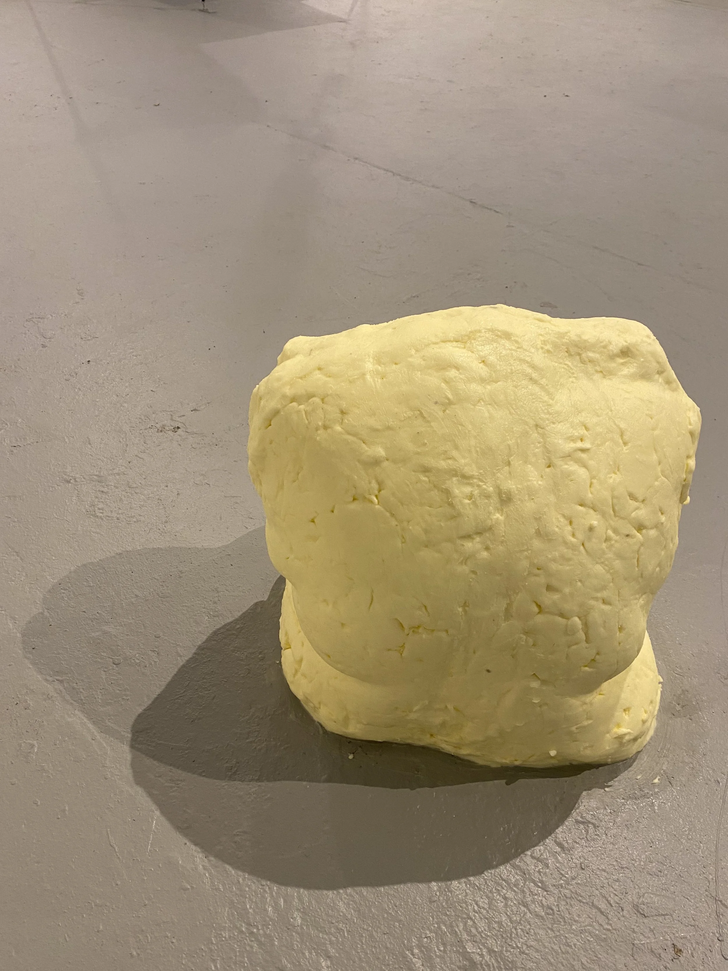 To produce butter torso (2021) I sat as plaster bandages were draped, rubbed, and hardened around me. My hunched, seated position mirroring my stance of self-observation I so often find myself in- head looking down towards my belly.